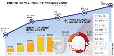 在移動支付市場上,支付寶和擁有財付通、微信支付的騰訊金融雙寡頭局勢顯現(xiàn)。今年4月,易觀2017年第四季度中國第三方支付移動支付市場數(shù)據(jù)顯示,第三方移動支付市場交易規(guī)模為37.7萬億元,環(huán)比增長27.91%。其間支付寶和騰訊金融兩巨頭的份額分別為54.26%和38.15%,合計92.41%。