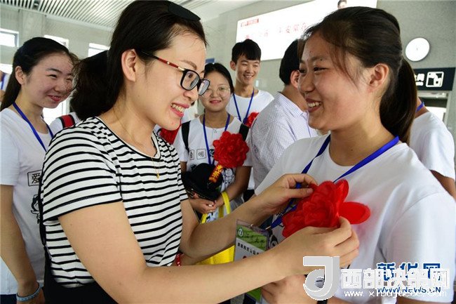 7月10日,送行老師為參加支教的志愿者戴上光榮花。
