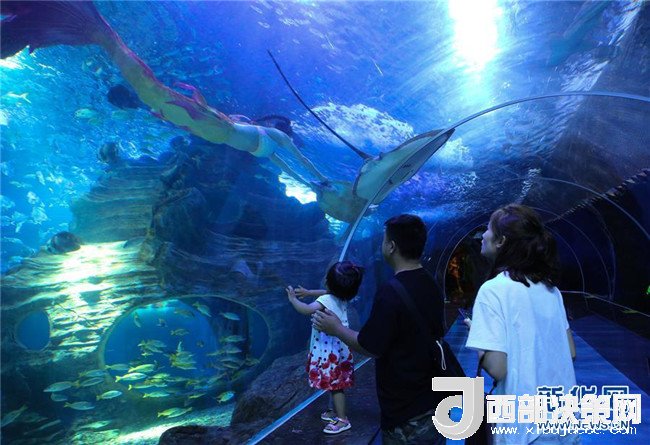 7月30日,家長帶著孩子在貴陽一家海洋世界觀看“美人魚”表演。