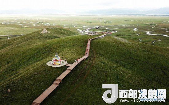游客在瑪曲縣阿萬倉濕地的觀景步道上游覽(7月31日無人機拍攝)。新華社記者 陳斌 攝