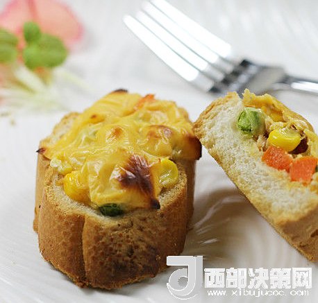 1.面包最好選用法棍面包等歐式面包,斜切成大片;提前將青豆、玉米和紅蘿卜焯水;