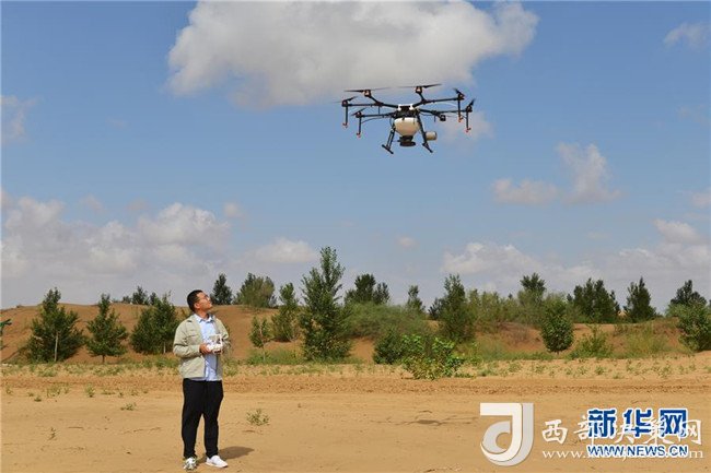 技術(shù)人員在位于內(nèi)蒙古鄂爾多斯市杭錦旗的庫布其沙漠里示范無人機植樹(7月24日攝)。 新華社記者 鄒予 攝