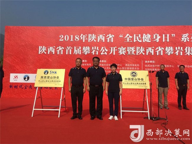 隨后陜西省登山協(xié)會主席陳錚向省攀巖集訓(xùn)隊教練組代表邱洪樹授“陜西省攀巖集訓(xùn)隊”隊旗,并頒發(fā)聘書。陜西省社會體育管理中心主任田凱、渭南市體育局副局長王曉燕、陜西華山旅游集團有限公司副總經(jīng)理趙江峰同志共同為“陜西省攀巖訓(xùn)練基地”揭牌。
