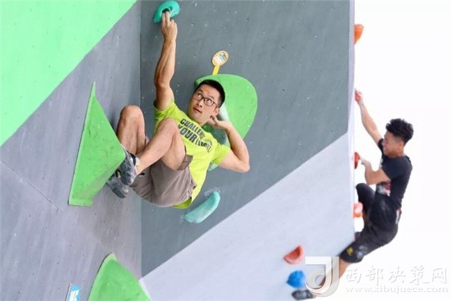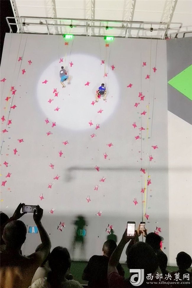 專業(yè)攀巖選手與資深攀巖愛好者在難度賽道進行表演賽