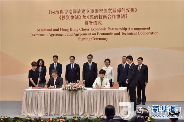 2017年6月28日在香港特區(qū)政府總部拍攝的《內(nèi)地與香港關(guān)于建立更緊密經(jīng)貿(mào)關(guān)系的安排》(CEPA)下的《投資協(xié)議》和《經(jīng)濟(jì)技術(shù)合作協(xié)議》簽約儀式現(xiàn)場。 新華社發(fā)(王璽攝)