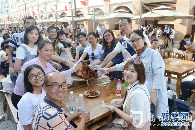 8月18日,來自上海等地的游客在烏魯木齊二道橋大巴扎步行街品嘗烤全羊。