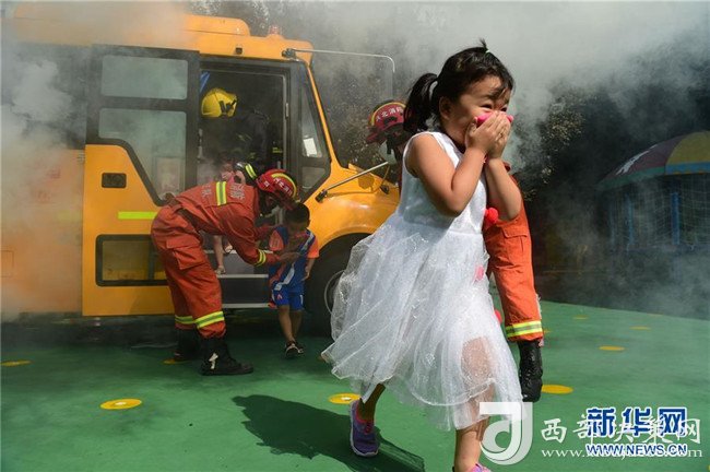 8月27日,滄州市公安消防支隊(duì)新華區(qū)建設(shè)大街中隊(duì)的消防戰(zhàn)士指導(dǎo)幼兒園的孩子從“著火”的校車中緊急疏散。
