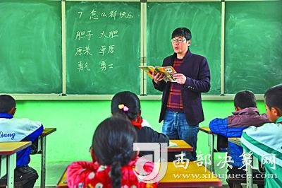 在甘肅省永靖縣小嶺鄉(xiāng)土門村土門小學(xué),校長鮮虎給一年級學(xué)生上語文課。新華社記者 范培珅攝
