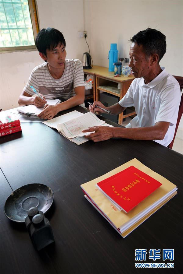 9月4日,在蘆嶺教學(xué)點(diǎn),陳云根(右)與黃文春探討新學(xué)期教學(xué)計(jì)劃。 新華社記者 宋振平 攝