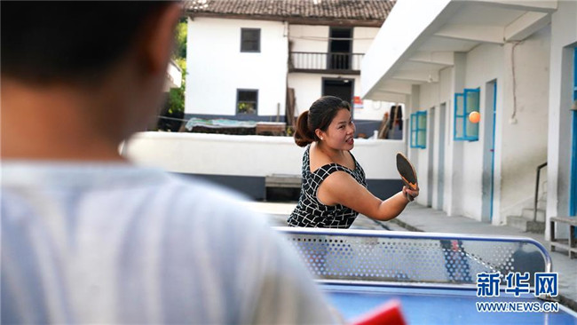 9月4日,陳春英和學(xué)生打乒乓球。 新華社記者胡晨歡 攝