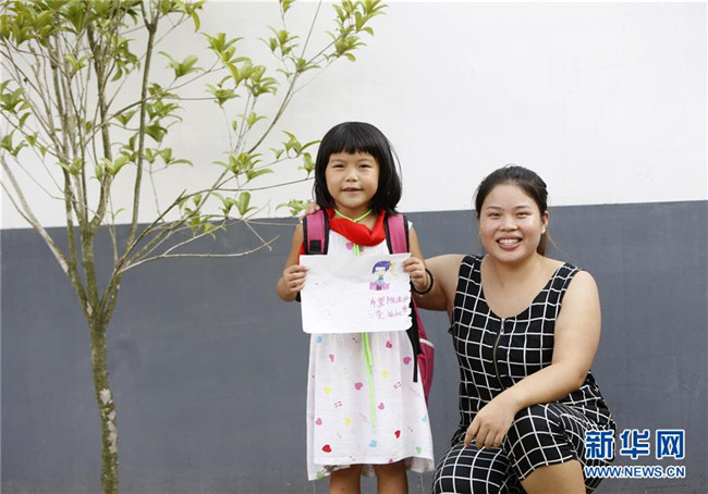 9月4日,一名小女孩將自己畫的畫送給陳春英,并與老師合影留念。 新華社記者段卓力 攝