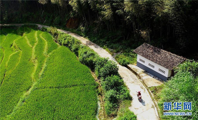9月4日,陳春英騎摩托車前去領(lǐng)取學(xué)生們的營養(yǎng)餐(無人機拍攝)。新華社記者胡晨歡 攝