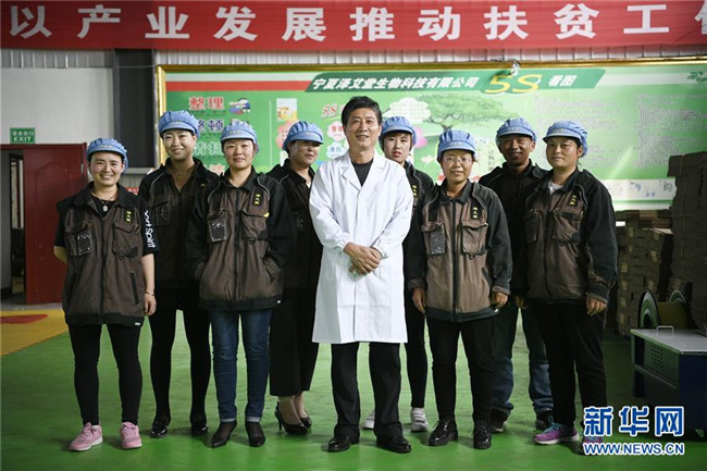 林玉清(左五)與當(dāng)?shù)貑T工合影(8月30日攝)。來(lái)自福建莆田的林玉清2017年3月在西吉縣成立寧夏澤艾堂生物科技有限公司,依托西吉縣優(yōu)質(zhì)的艾草種植條件,采用“公司+合作社+農(nóng)戶”的訂單農(nóng)業(yè)合作模式,與吉強(qiáng)、新?tīng)I(yíng)等鄉(xiāng)鎮(zhèn)種植專(zhuān)業(yè)合作社合作建成艾草種植基地11個(gè)、推廣種植艾草6000畝,為當(dāng)?shù)厝罕娒撠氈赂讳伨托侣纷?。新華社記者王鵬攝
