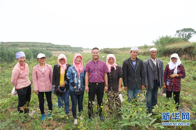 來(lái)自福建長(zhǎng)樂(lè)的林錦云(右五)在寧夏固原市河川鄉(xiāng)與當(dāng)?shù)剞r(nóng)戶合影(8月28日攝)。2014年,林錦云通過(guò)土地流轉(zhuǎn)方式,承包了河川鄉(xiāng)1.5萬(wàn)畝荒山,打造油用牡丹生產(chǎn)基地。目前,林錦云種下的7600畝油用牡丹已經(jīng)開(kāi)始受益,公司已就近吸納村民300多人就業(yè),其中建檔立卡戶39戶,人均年收入2萬(wàn)多元。 新華社記者姜克紅攝