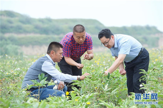 來(lái)自福建長(zhǎng)樂(lè)的林錦云(中)在寧夏固原市河川鄉(xiāng)與福建對(duì)口支援農(nóng)業(yè)專(zhuān)家(右)交流牡丹種植技術(shù)(8月28日攝)。2014年,林錦云通過(guò)土地流轉(zhuǎn)方式,承包了河川鄉(xiāng)1.5萬(wàn)畝荒山,打造油用牡丹生產(chǎn)基地。目前,林錦云種下的7600畝油用牡丹已經(jīng)開(kāi)始產(chǎn)生效益,公司已就近吸納村民300多人就業(yè),其中建檔立卡戶39戶,人均年收入2萬(wàn)多元。 新華社記者姜克紅攝