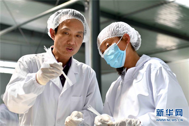 黃玉仁(左)在寧夏固原市隆德縣寧夏黃土地農(nóng)業(yè)食品有限公司與員工交流馬鈴薯粉絲制作技術(shù)(8月29日攝)。來(lái)自福建莆田的黃玉仁2017年在隆德縣創(chuàng)辦寧夏黃土地農(nóng)業(yè)食品有限公司,利用當(dāng)?shù)伛R鈴薯種植優(yōu)勢(shì),制作馬鈴薯深加工產(chǎn)品,促進(jìn)當(dāng)?shù)伛R鈴薯銷(xiāo)售和農(nóng)民增收。目前公司已建成4條生產(chǎn)線,為當(dāng)?shù)?0多名百姓解決就業(yè)。 新華社記者郭緒雷攝