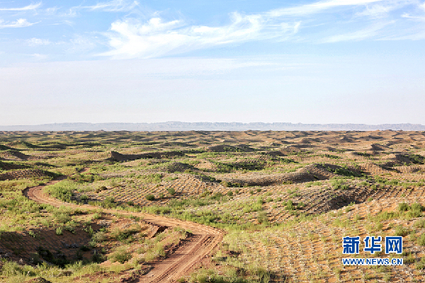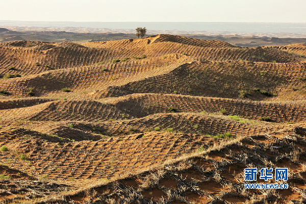 通過(guò)“麥草方格”模式組成的“沙帳植物帶”。新華網(wǎng)陳延特?cái)z