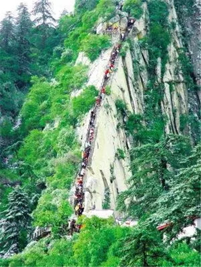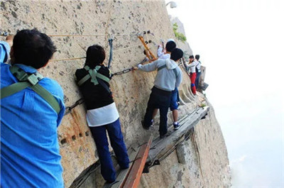 具有700多年歷史的長空棧道,在華山南峰東側(cè)山腰的萬仞絕壁上鑿出來的幾個踏腳之處,鑲嵌石釘搭木椽搭建了一個百余米懸空的棧道,讓人望而卻步,如果你有恐高癥,僅僅看一眼都會讓你驚恐萬分。2013年,著名旅游網(wǎng)站“Smarter Travel”盤點全球最恐怖懸崖步道,將華山長空棧道列為全球十大最恐怖的懸崖步道之一。