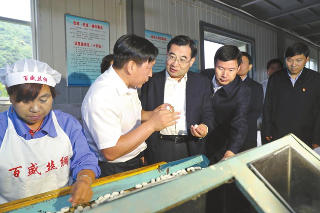9月13日,省委書記胡和平深入商洛市鎮(zhèn)安縣調(diào)研脫貧攻堅(jiān)工作。圖為在百盛繅絲廠,胡和平了解選繭、繅絲等生產(chǎn)流程,聽取公司生產(chǎn)經(jīng)營(yíng)和脫貧幫扶情況介紹。 記者 宋紅梅攝