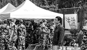 郇政華和穿著軍訓(xùn)服的新生們在校園里。