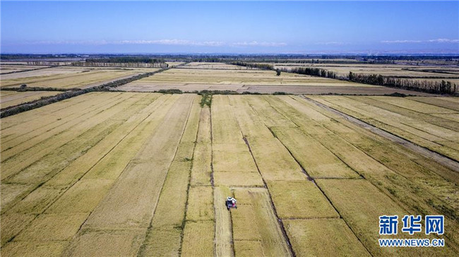 收割機(jī)在地處新疆察布查爾錫伯自治縣種羊場(chǎng)的“萬(wàn)畝水稻優(yōu)質(zhì)高產(chǎn)高效示范區(qū)”收割水稻(9月26日無(wú)人機(jī)拍攝)。眼下,地處新疆伊犁河谷的察布查爾錫伯自治縣約20萬(wàn)畝水稻迎來(lái)收割季。當(dāng)?shù)剞r(nóng)民搶抓農(nóng)時(shí),忙碌在金色田園中。記者 胡虎虎 攝