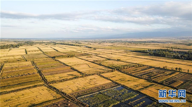 新疆察布查爾錫伯自治縣坎鄉(xiāng)待收割的水稻(9月25日無(wú)人機(jī)拍攝)。眼下,地處新疆伊犁河谷的察布查爾錫伯自治縣約20萬(wàn)畝水稻迎來(lái)收割季。當(dāng)?shù)剞r(nóng)民搶抓農(nóng)時(shí),忙碌在金色田園中。記者 胡虎虎 攝