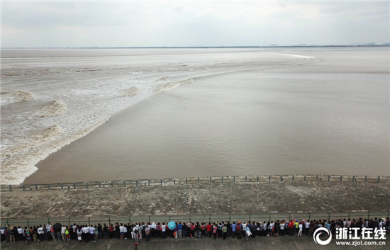 9月26日,農(nóng)歷八月十七,海寧大缺口觀潮點,千名游客在江堤上安全觀潮。(浙江在線記者 董旭明 攝)