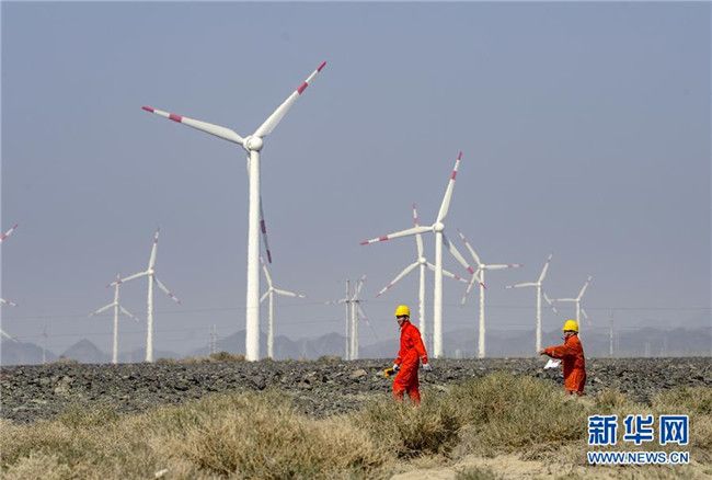 在烏魯木齊近郊的達(dá)坂城風(fēng)力發(fā)電場,兩位工作人員在巡檢風(fēng)力發(fā)電設(shè)備(9月18日攝)。