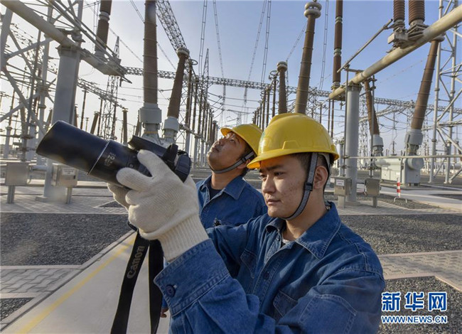 在吐魯番市750千伏變電站,兩位工作人員利用專用設(shè)備對電力設(shè)施進(jìn)行檢查(9月18日攝)。記者趙戈 攝
