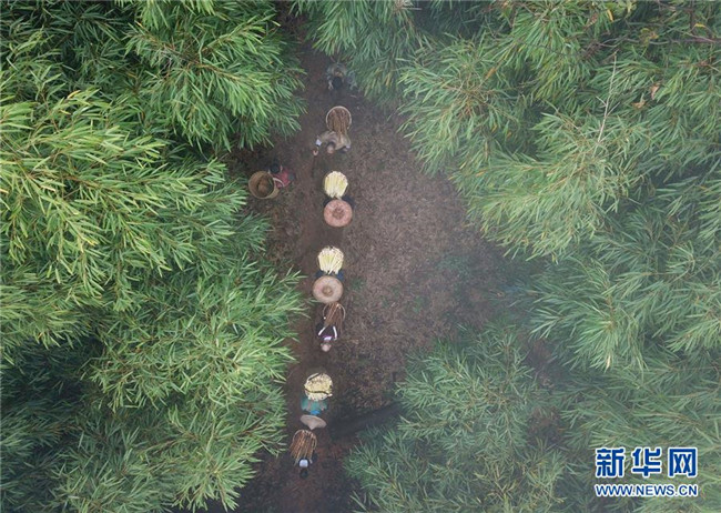 10月14日,在貴州赤水市寶源鄉(xiāng)聯華村,竹農將采挖的竹筍背下山(無人機拍攝)。金秋時節(jié),貴州省赤水市寶源、兩河口、丙安等鄉(xiāng)鎮(zhèn)種植的5萬余畝大竹筍迎來收獲季。當地竹農加緊采挖竹筍,進行加工后外銷。素有“中國竹子之鄉(xiāng)”的赤水市,現有竹林面積132.8萬畝。竹產業(yè)已經成為當地脫貧增收的主要渠道之一。 (王長育 攝)