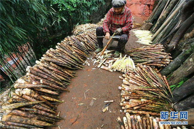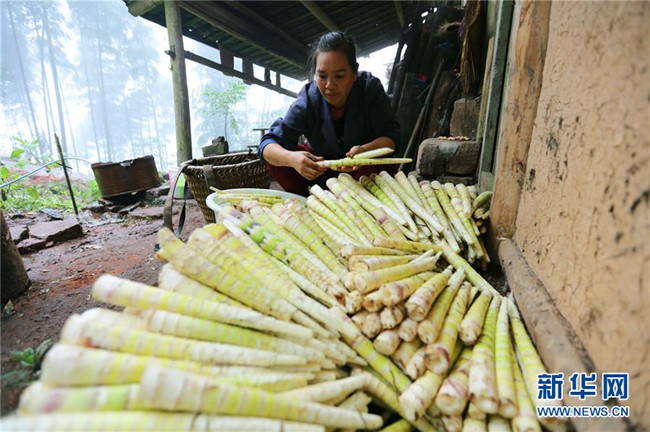 10月14日,在貴州赤水市寶源鄉(xiāng)聯華村,竹農為鮮筍去殼。金秋時節(jié),貴州省赤水市寶源、兩河口、丙安等鄉(xiāng)鎮(zhèn)種植的5萬余畝大竹筍迎來收獲季。當地竹農加緊采挖竹筍,進行加工后外銷。素有“中國竹子之鄉(xiāng)”的赤水市,現有竹林面積132.8萬畝。竹產業(yè)已經成為當地脫貧增收的主要渠道之一。 (王長育 攝)
