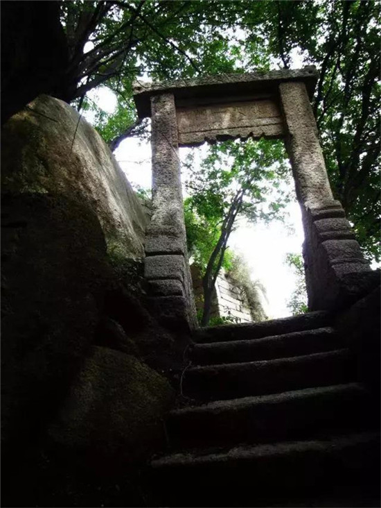 北斗坪上蒼松參天,青竹挺翠,初入有石卷門,稱總天一門。舊時(shí)門前石牌樓有鐵獅一對(duì),分立兩側(cè),獅高數(shù)尺,生動(dòng)逼真,今移至東道院。過(guò)門行數(shù)步,可見兩山環(huán)抱,風(fēng)景宜人,一石坊,額書“紫宸駐蹕”,意為這里是紫微星官居住的地方。