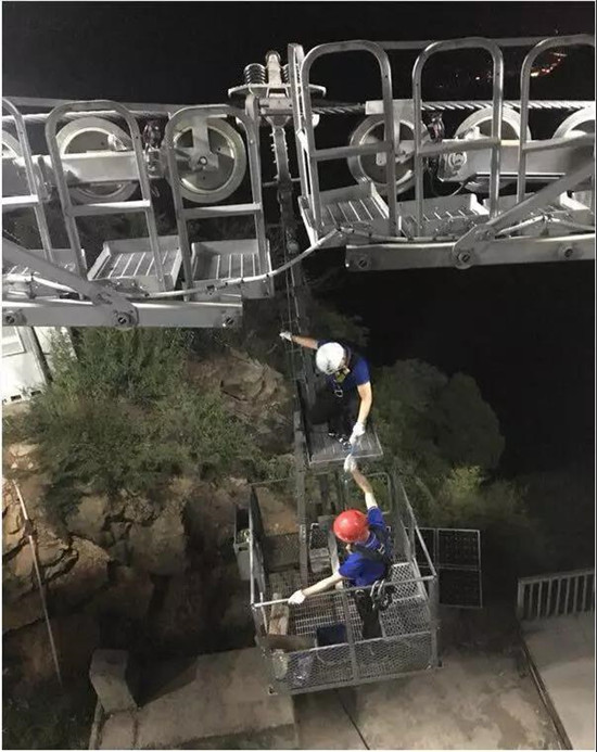 每年的五一和十一是景區(qū)游客最多的時(shí)候,也是索道維護(hù)工最忙的時(shí)候。除了正常巡線外,維護(hù)工還要分出一部分人到每個(gè)支架下面固定值守。有一年送完游客后剛準(zhǔn)備撤離時(shí),山上突然刮起了大風(fēng),索道保護(hù)性停車,值守在支架下的維護(hù)工們就在野外呆了一夜。山上夜晚的風(fēng)特別大,感覺能把人連帳篷吹到溝里去。那一夜,巨文躲進(jìn)套在支架爬梯外邊的鐵皮護(hù)筒里,蜷縮著熬過了一個(gè)漫長(zhǎng)的夜晚。