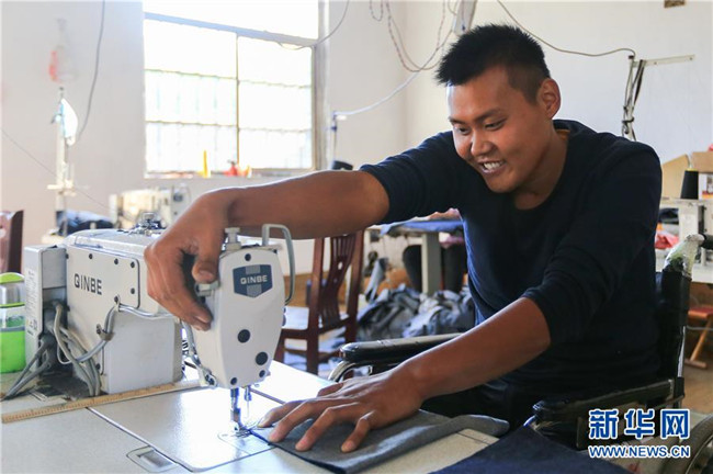 在山東蘭陵縣礦坑鎮(zhèn)朱柳屯村的扶貧車間,貧困戶范加誠(chéng)操作縫紉機(jī)加工布料(10月10日攝)。今年29歲的范加誠(chéng)八年前在建筑工地打零工時(shí)被因意外造成高位截癱。2016年,5萬元扶貧貸款為范加誠(chéng)扶貧車間建設(shè)送來“及時(shí)雨”。一個(gè)月的時(shí)間,他就有了寬敞明亮的加工車間和8臺(tái)嶄新的縫紉機(jī)。新華社記者 王南 攝