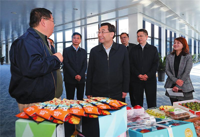 10月31日,省委書(shū)記胡和平深入西安市部分民營(yíng)企業(yè)調(diào)研。圖為他在海升集團(tuán)果業(yè)總部聽(tīng)取產(chǎn)品種類(lèi)、產(chǎn)業(yè)扶貧等情況介紹。 記者 宋紅梅攝
