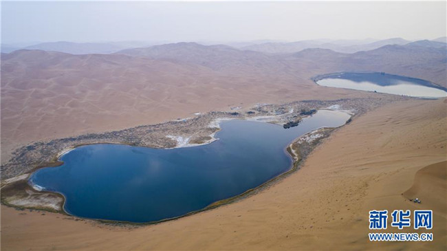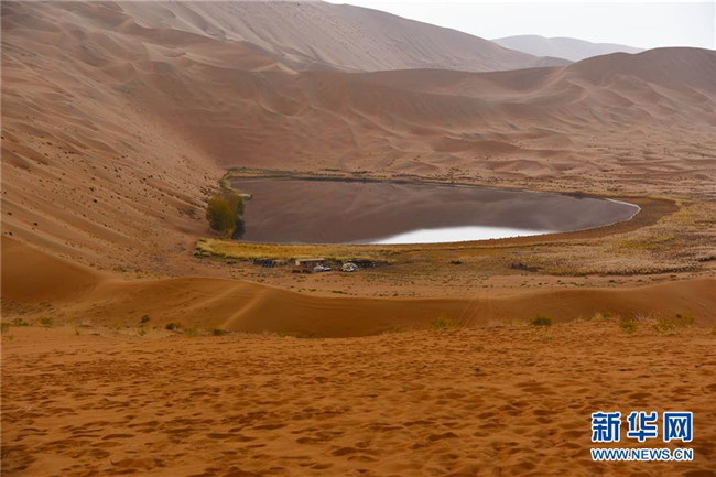 陰雨中的沙漠湖泊,常常讓人以為是一面鏡子(10月18日攝)。 巴丹吉林沙漠位于內(nèi)蒙古西部阿拉善盟,是中國第三大沙漠,沙丘起伏的曲線陡變成高聳的沙山,碧藍(lán)的湖泊散落在沙海間。 新華社記者 李仁虎 攝