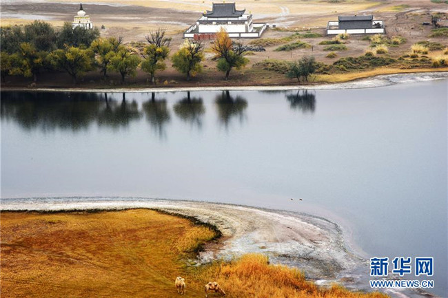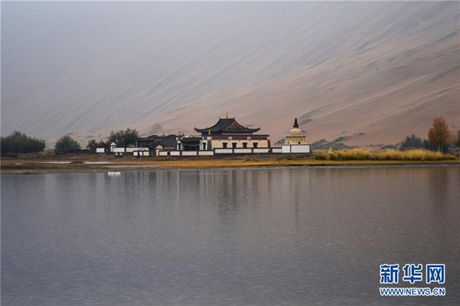 巴丹吉林廟位于名為“廟海子”的湖泊旁(10月19日攝)。 巴丹吉林沙漠位于內(nèi)蒙古西部阿拉善盟,是中國第三大沙漠,沙丘起伏的曲線陡變成高聳的沙山,碧藍(lán)的湖泊散落在沙海間。 新華社記者 李仁虎 攝