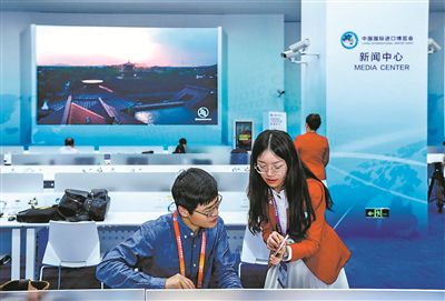 11月4日,首屆中國國際進口博覽會進入1天倒計時。來自復旦大學、上海交通大學等34所上海高校的5200多名大學生志愿者,成為進博會志愿者隊伍的主力軍。圖為進博會新聞中心的東華大學志愿者(右)在為記者解答問題。 張勁松 攝