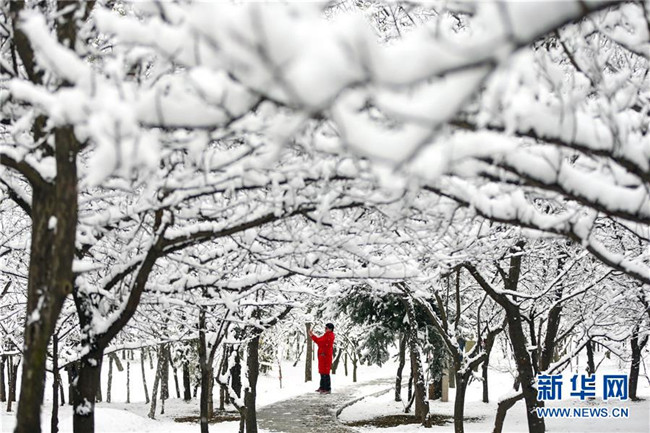 當(dāng)日,甘肅省平?jīng)鍪谐霈F(xiàn)降雪天氣,銀裝素裹的冰雪世界吸引市民前來欣賞雪景。新華社發(fā)(吳希會 攝)