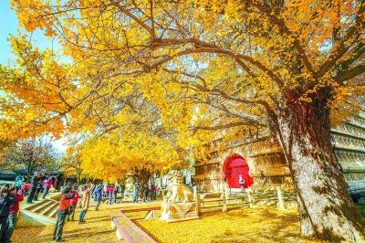 金秋時(shí)節(jié),京城各公園和景區(qū)落葉繽紛,美景如畫。昨天,北京石刻藝術(shù)博物館內(nèi)的真覺寺金剛寶座旁,兩株樹齡近600歲的古銀杏樹一片金黃,吸引市民觀賞留影。本報(bào)記者 武亦彬攝