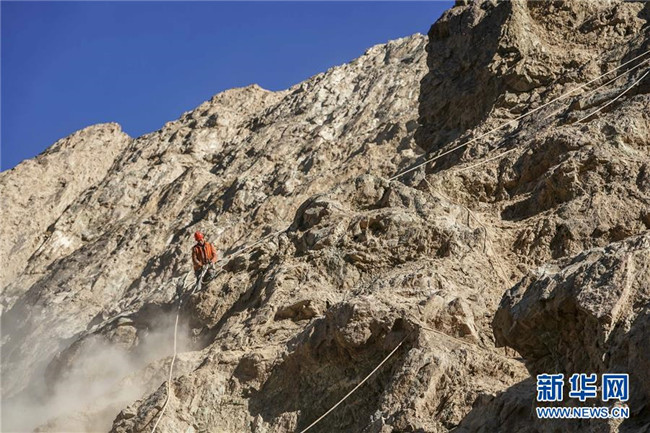 11月12日,在新疆塔什庫(kù)爾干塔吉克自治縣大同鄉(xiāng)鄉(xiāng)政府附近的一處路段,工人背著施工設(shè)備在峭壁上攀爬。 近日,一支由四川、云南等地工人組成的施工隊(duì)忙碌在帕米爾高原深處的大山中,為塔什庫(kù)爾干塔吉克自治縣縣城至大同鄉(xiāng)道路的易落石路段安裝防護(hù)網(wǎng)。崇山峻嶺間,工人要攀爬至峭壁上施工作業(yè),如躍動(dòng)在大山間的“舞者”。據(jù)介紹,這支施工隊(duì)常年活躍在新疆山區(qū)道路的施工現(xiàn)場(chǎng),為風(fēng)險(xiǎn)路段加裝安全防護(hù)裝置,保障過往車輛和沿途村民出行安全。 新華社記者 胡虎虎 攝
