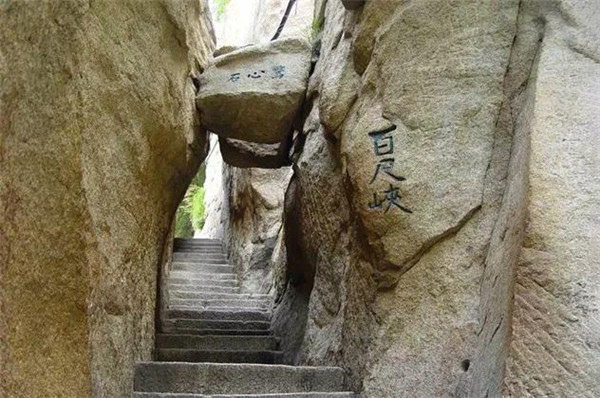 幢去峽復(fù)來,天險不可瞬。雖云百尺峽,一尺一千仞。”過千尺幢向北折即到“百尺峽”,它也叫“百丈崖”,仍是一處危石聳峙,直插云表,令人望而生畏的地方。峽的兩壁欲合,卻被飛來的兩顆石塊從中撐開,人從石頭下鉆過,膽戰(zhàn)心驚,生怕石塊從兩壁間掉下來,這就是“驚心石”。通過此石懸著的心才放下來,再回頭看原來此處卡著的兩塊石頭,是上大下小故能安然無恙,所以這顆石頭也被稱之為“平心石”。故韓愈詩中有“俄然神功就,殺氣見棱角”的描寫。