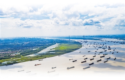 船舶在湖北武漢陽邏港區(qū)水域行駛(2018年8月13日無人機(jī)拍攝)。 |