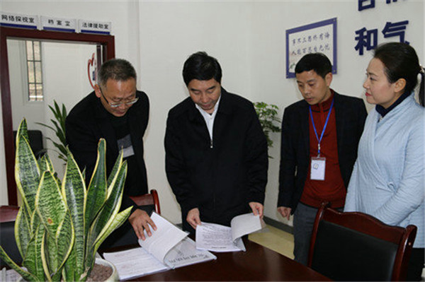 在張壩司法所,劉志誠察看了社區(qū)矯正宣告室、人民調(diào)解室、法律援助工作站,仔細(xì)翻閱相關(guān)資料,關(guān)切詢問工作人員司法所人民調(diào)解、法律援助等業(yè)務(wù)工作情況及對司法行政工作意見建議。走進(jìn)龍馬潭區(qū)誠達(dá)公證處,映入眼簾的標(biāo)識標(biāo)牌讓劉志誠對該處的黨建引領(lǐng)和文化建設(shè)表示滿意,他親切地與公證員交流互動,了解公證處黨建促發(fā)展、公證參與司法輔助、“最多跑一次”、等工作情況。劉志誠指出,公證服務(wù)是黨委政府為民服務(wù)的形象和代表,要把人民群眾滿不滿意作為檢驗(yàn)公證工作成效的標(biāo)準(zhǔn),全心全意為群眾做好法律服務(wù)。在自貿(mào)區(qū)在建瀘州市公共法律服務(wù)中心,劉志誠指出,公共法律服務(wù)中心是服務(wù)群眾的窗口,在設(shè)計(jì)規(guī)劃中要拓寬思路,整合法律服務(wù)功能,從便民利民出發(fā),從群眾的需要做起,將公共法律服務(wù)中心建成群眾滿意、企業(yè)滿意、黨委政府滿意的標(biāo)準(zhǔn)化服務(wù)平臺。