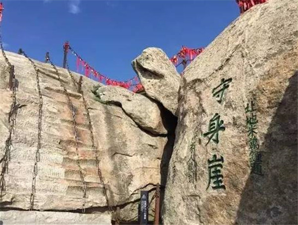 位于華山西峰頂摘星石北。民間傳說(shuō)古時(shí)有個(gè)孝子,雙親身染重疾,久治不愈,聽(tīng)說(shuō)岳神靈驗(yàn),便登山拜神求醫(yī)。在向岳神祈禱的過(guò)程中,孝子許愿說(shuō)只要雙親病愈,愿舍去自己的性命來(lái)報(bào)答神靈。果然,當(dāng)孝子返回家中時(shí),父母都已康復(fù),且已下田耕作去了。孝子還愿來(lái)到華山,毫不猶豫的從此處跳下深淵,可他卻覺(jué)得身體若有人托起,似乘長(zhǎng)風(fēng),飄飄欲仙。待清醒時(shí),原來(lái)依然躺在家中,似夢(mèng)非夢(mèng)。孝子知道是華山神暗中相助,便告別父母到華山西峰作了道士。后人被孝子的誠(chéng)心感動(dòng),就將此處命名為舍身崖。 清道光年間李榕的伯祖李仁龍為阻止后人仿效孝子的行為,改舍身崖為省身崖,以警示忤逆之街徒游到這里時(shí)應(yīng)對(duì)照孝子,自警自省,痛改前非。后來(lái)又有人認(rèn)為舍身救雙親的行為并不可取,也稱崖作守身崖,以教育后人生命可貴,不可輕擲。