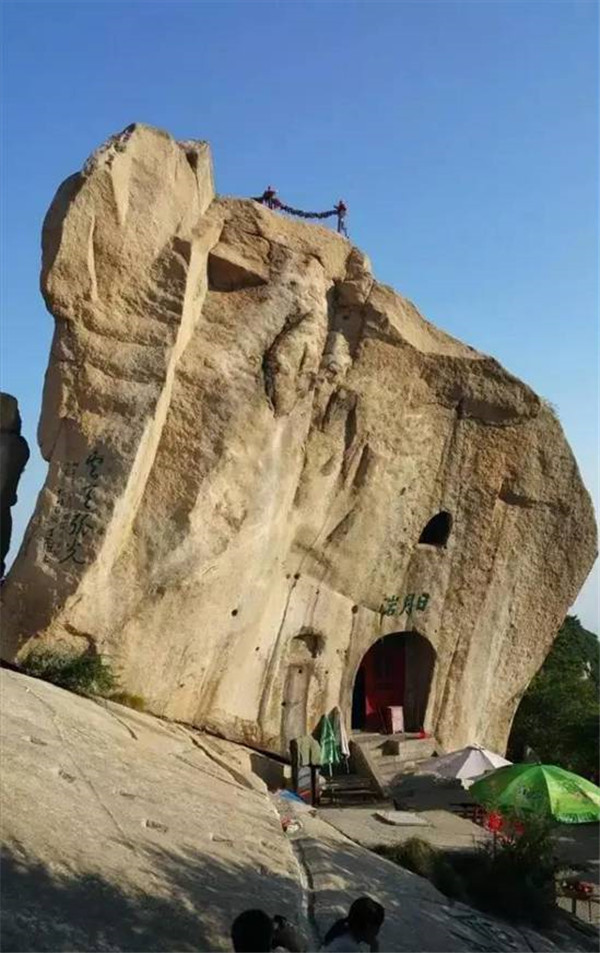 看過(guò)金庸武俠小說(shuō)的童鞋們,一定聽(tīng)過(guò)全真教。那么全真崖呢?它位于南天門(mén)西,為松檜峰頂向南懸空傾伸之崖石。出南天門(mén)越長(zhǎng)空棧道可至崖下。崖腹部有賀老石室,是元初道士賀志真開(kāi)辟的修行之地?!赌戏逵洝分杏浭觯?ldquo;巖類俯首形,遙覆室上,上書(shū)“全真巖”三字,赤色以實(shí)之。雖知人所為,然上不可下,下不可上,其履虛而作之邪?何其神也!”
