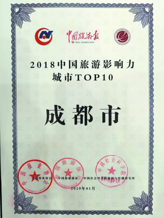 經(jīng)文化和旅游部批準(zhǔn),1月23日,以“新時(shí)代新視野新傳播新動(dòng)能”為主題的2019中國(guó)旅游產(chǎn)業(yè)發(fā)展年會(huì)在京舉辦。文化和旅游部黨組成員、故宮博物院院長(zhǎng)單霽翔作了《文旅融合的故宮實(shí)踐》主題演講,文化和旅游部黨組成員王曉峰作主旨講話,人民日?qǐng)?bào)社原副社長(zhǎng)、中國(guó)報(bào)業(yè)協(xié)會(huì)理事長(zhǎng)張建星致辭。在2018年中國(guó)旅游產(chǎn)業(yè)影響力風(fēng)云榜的評(píng)選中,成都入選“2018中國(guó)旅游影響力城市TOP10”,一同入選的還有北京、杭州、蘇州、廣州等城市。此外,都江堰市入選“2018中國(guó)旅游影響力區(qū)縣TOP10”。