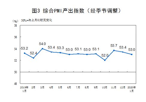 國家統(tǒng)計局今日公布數(shù)據(jù)顯示,截至2020年1月20日,采購經(jīng)理調查結果顯示, 1月份,中國制造業(yè)PMI為50.0%,非制造業(yè)商務活動指數(shù)為54.1%,綜合PMI產(chǎn)出指數(shù)為53.0%。
