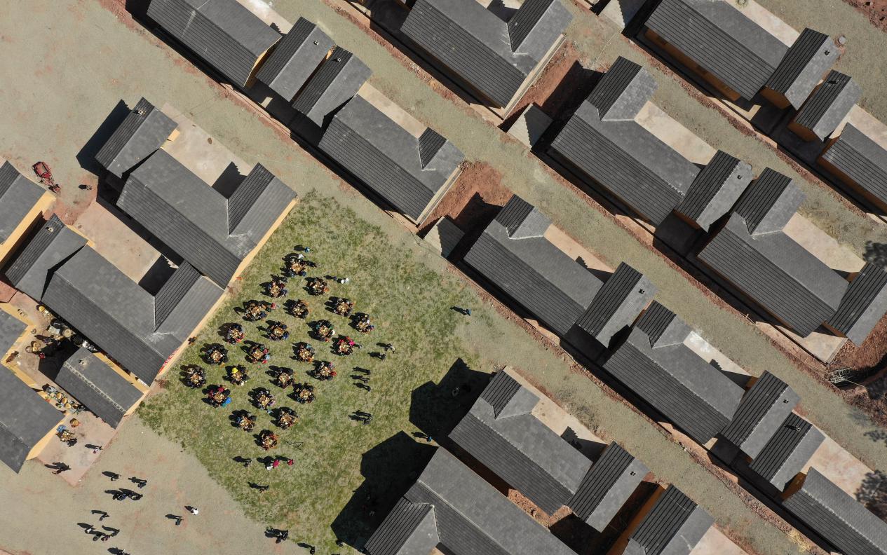 2019年2月11日,在昭覺縣三河村的易地扶貧安置點,彝族群眾圍坐在一起吃起壩壩宴,熱熱鬧鬧地慶祝喬遷之喜。來源:新華網
