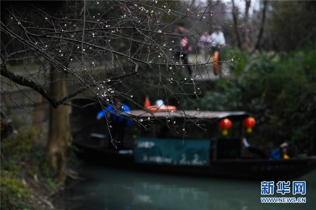 2月17日,游客在杭州西溪濕地國家公園乘船賞梅。